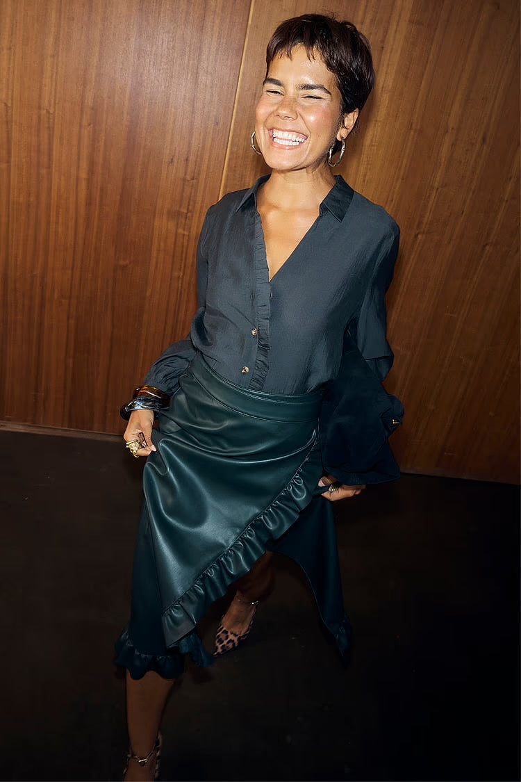Elevate your wardrobe with our Deep Green Ruffle Miley Shirt, featuring elegant blouson sleeves and a flowing silhouette that flatters every figure. The delicate ruffle detailing along the button stand adds subtle texture, while contrast tortoise buttons bring unique charm. Designed for versatility, this button-up shirt is multi-wear and breastfeeding friendly, delivering both style and practicality. The embroidered logo on the back neck adds a refined finishing touch that sets this classic piece apart.