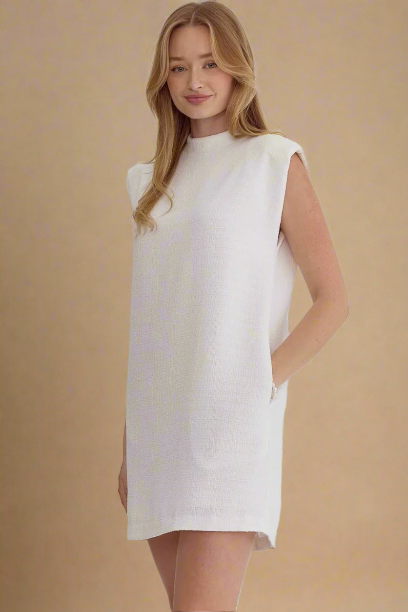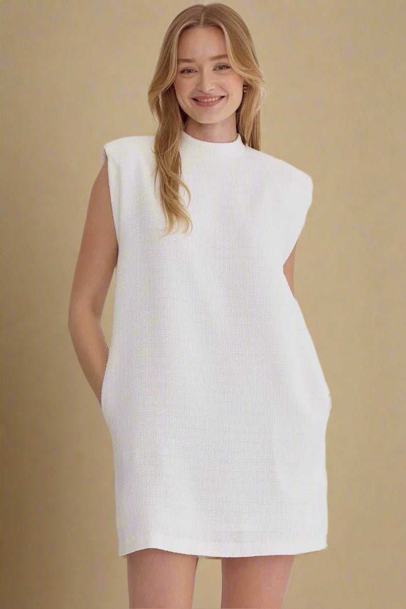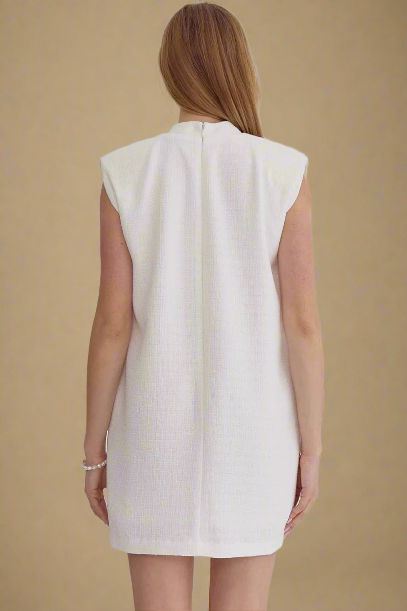 Chic, effortless, and made for the spotlight—our Let’s Tailgate Dress is the ultimate game day-to-cocktail hour piece. Crafted in a crisp white textured fabric, this sleeveless mini channels modern sophistication with its clean lines and strong, padded shoulders. The structured silhouette flatters while keeping things breezy, making it the perfect choice for warm afternoons that roll into lively evenings.