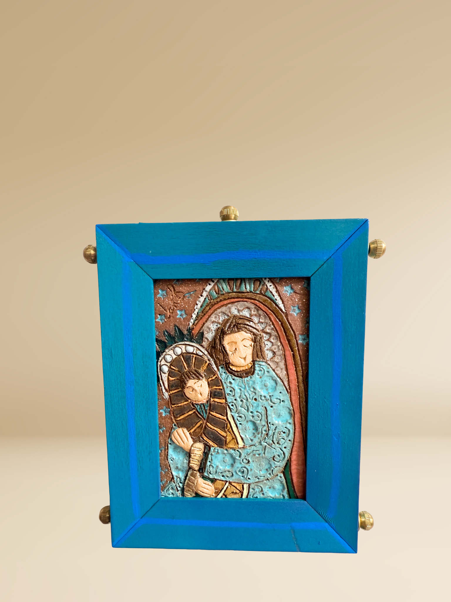 Tender and luminous, the Madonna Guadalupe w/ Brass is a devotional piece that radiates love, peace, and quiet strength. Framed in a rich turquoise wood with gleaming brass finials, this handcrafted relief depicts a serene Madonna embraced by Saint Joseph—both cloaked in celestial blue with halos of stars and sacred patterning. Her expression is gentle, eyes closed in grace, while his arms offer shelter and reverence. A contemporary folk rendering of divine protection, this piece is perfect for those seeking a sacred reminder of hope, unity, and the power of enduring love.