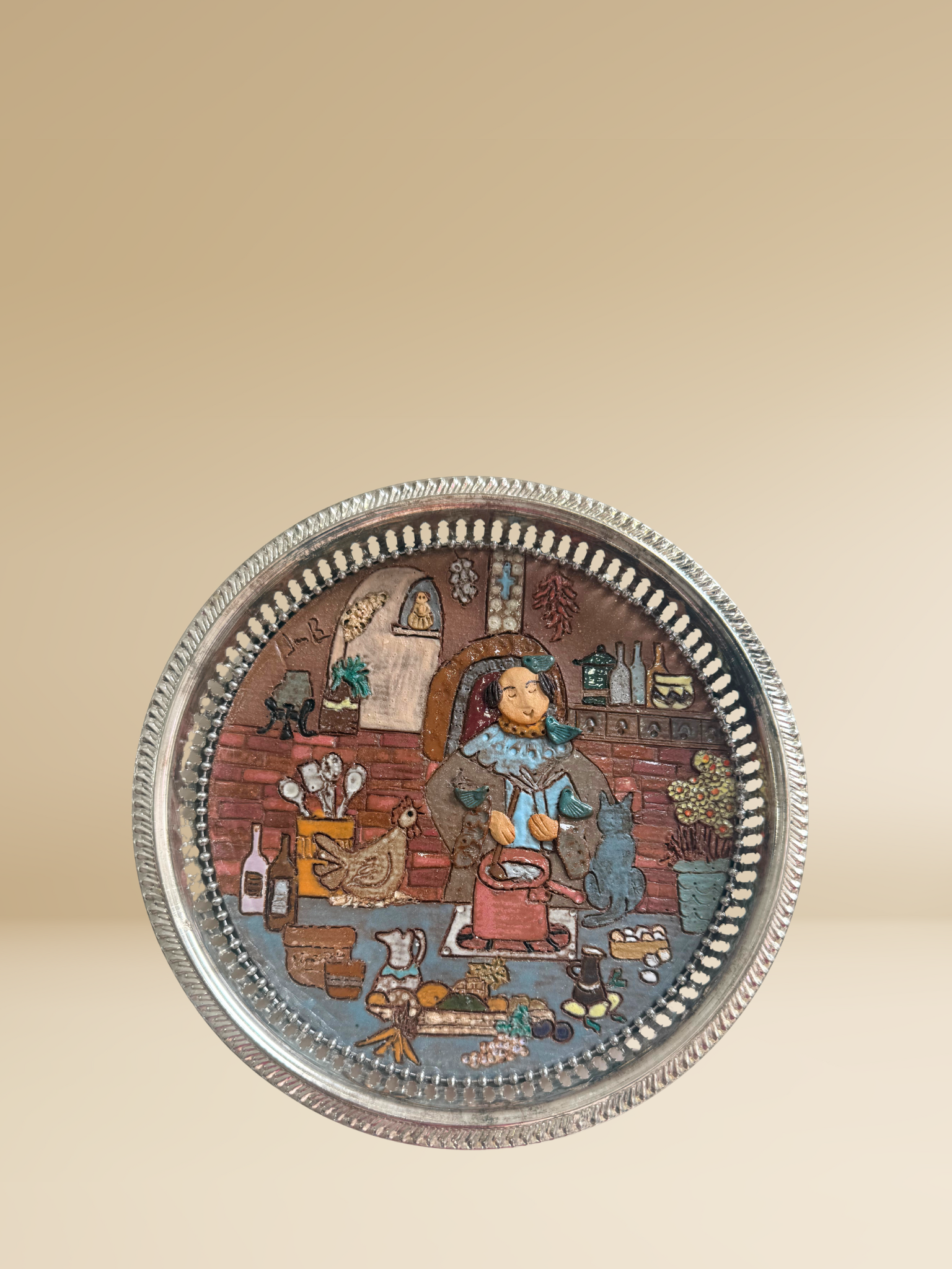 Brimming with charm, color, and culinary spirit, the San Pascual 9" Diameter piece celebrates the patron saint of kitchens with warmth and whimsy. Nestled in a vintage silver-toned tray, San Pascual is depicted in his cozy adobe kitchen—stirring a bubbling pot while surrounded by faithful animal companions, baskets of herbs, bottles of wine, fresh vegetables, and sacred symbols. A gentle rooster and a curious pup keep him company as birds flutter playfully nearby. Every detail—down to the glowing hearth and walls lined with spices—evokes the joy of nourishment and the holiness of hospitality. A heartfelt homage to the saint who blesses every stirring spoon and shared meal.