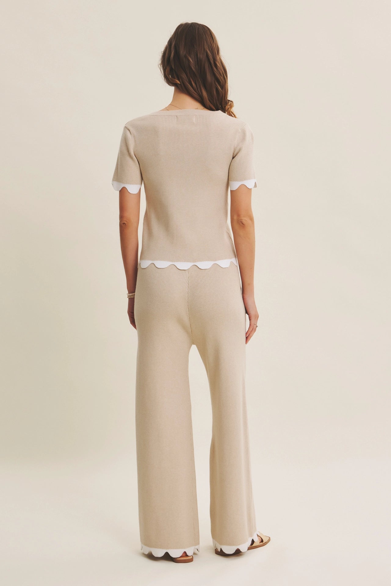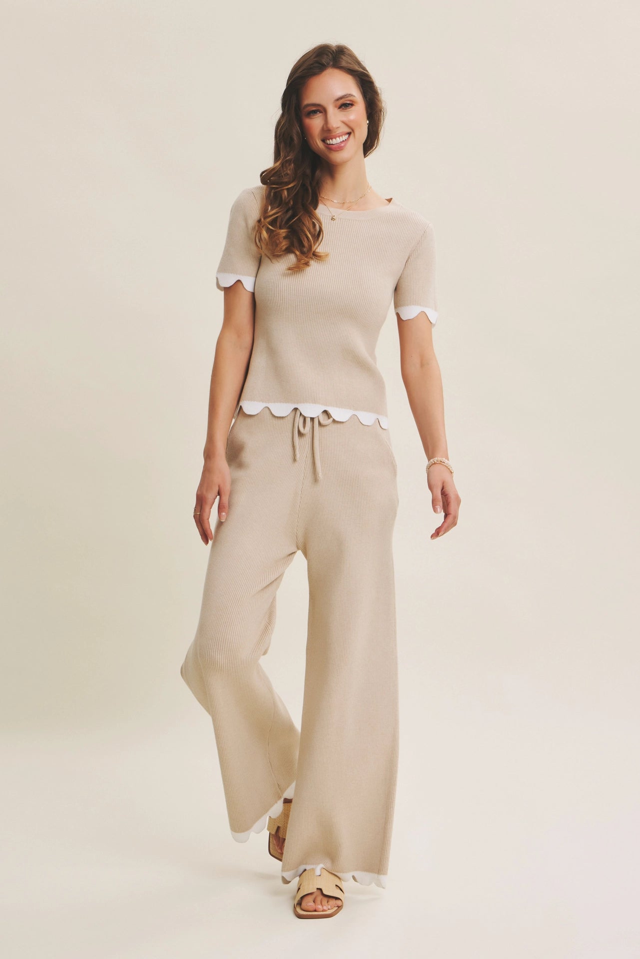 Sweet yet sophisticated, the Serena Scallop Short Sleeve Sweater Top brings a feminine finish to your everyday wardrobe. Crafted from a soft ribbed knit with just the right amount of stretch, this short-sleeve silhouette features delicate white scallop trim at the sleeves and hem for a playful contrast. Its tailored fit flatters without clinging, making it perfect for pairing with the matching lounge pant or styling solo with denim, trousers, or skirts. Elevated loungewear has never looked so charming.