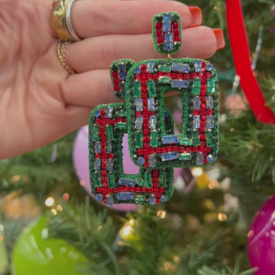 Indulge in luxury with our Tidings Tartan Earrings. These gorgeous, first-of-their-kind earrings feature a double-sided, fully gemstone plaid design, handmade for exquisite craftsmanship. Lightweight and versatile, they are the perfect accessory to elevate your Christmas outfit and capture stunning photos.