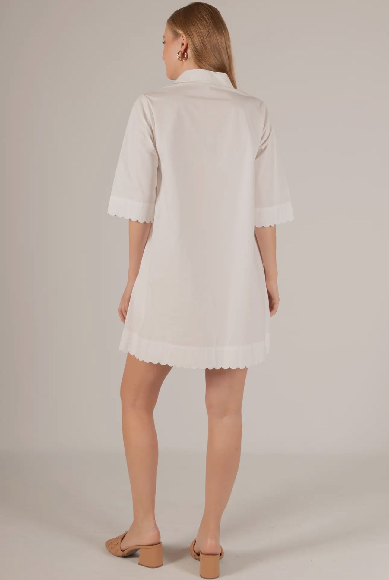 100% cotton white dress with scallop sleeves & hem. Lightweight, breathable & perfect for football game days, tailgates & southern gameday style.