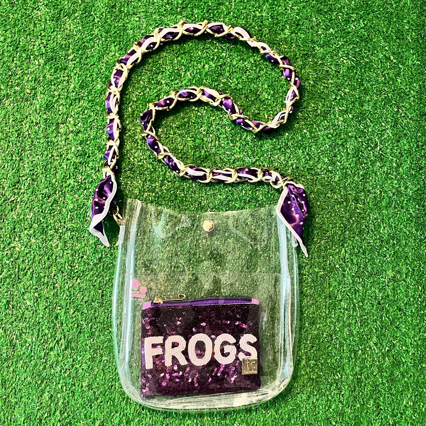 Experience ultimate privacy and style with our Frogs Beaded Privacy Pouch! Perfect for storing your personal items while on the go, this pouch is adorned with charming beadwork for the perfect gameday at TCU. Keep your belongings safe and discreet with this unique and delightful pouch.