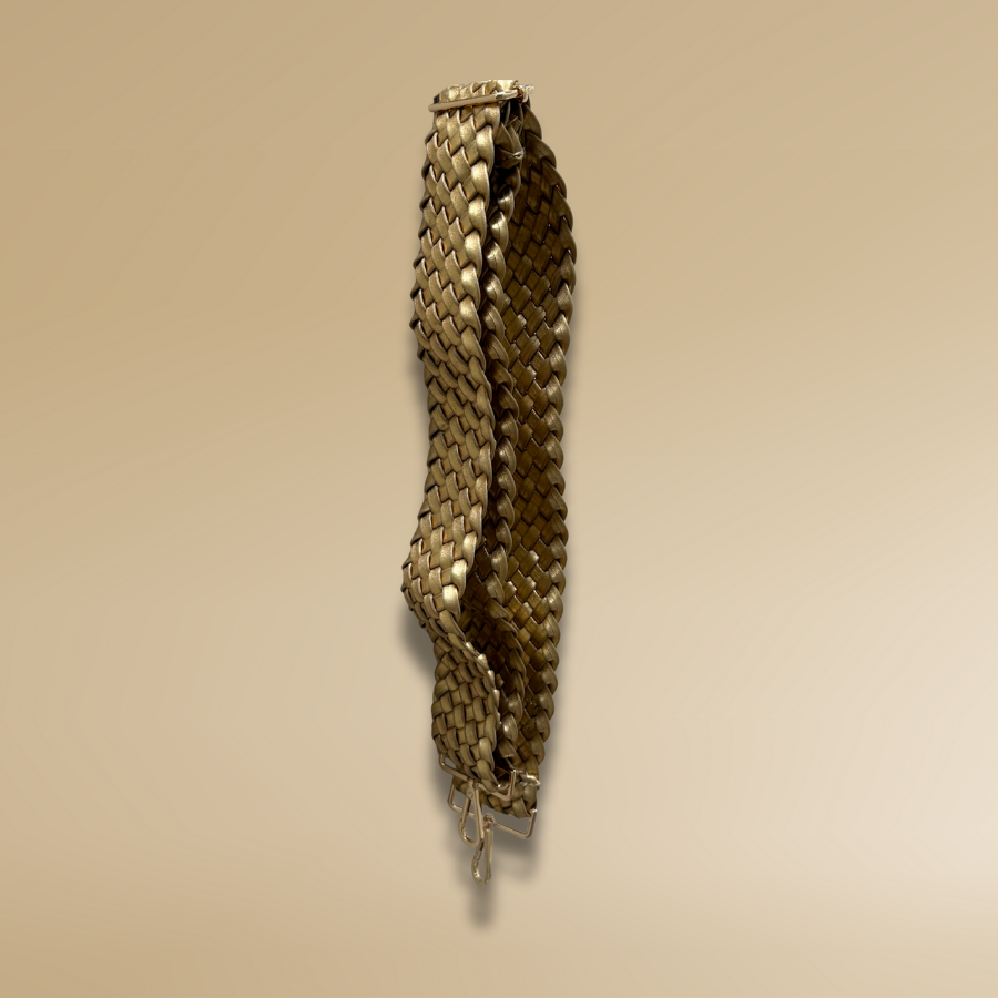 A fusion of function and flash, the Metallic Voyager Strap is crafted from intricately woven strands in a lustrous, golden finish—designed to elevate your everyday carry. Whether slung over the shoulder or worn crossbody, its wide silhouette offers both comfort and bold texture. The gleaming hardware and braided design lend a luxe, adventurous feel—perfect for those who travel light but make a statement.