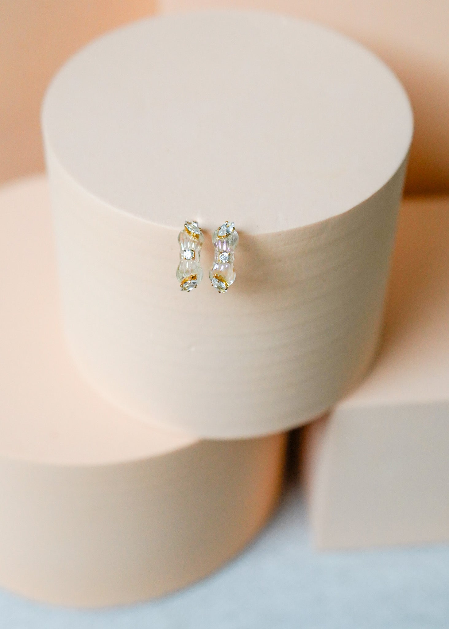 The Iridescent Knot Huggies are made with a surgical steel post and hypoallergenic.