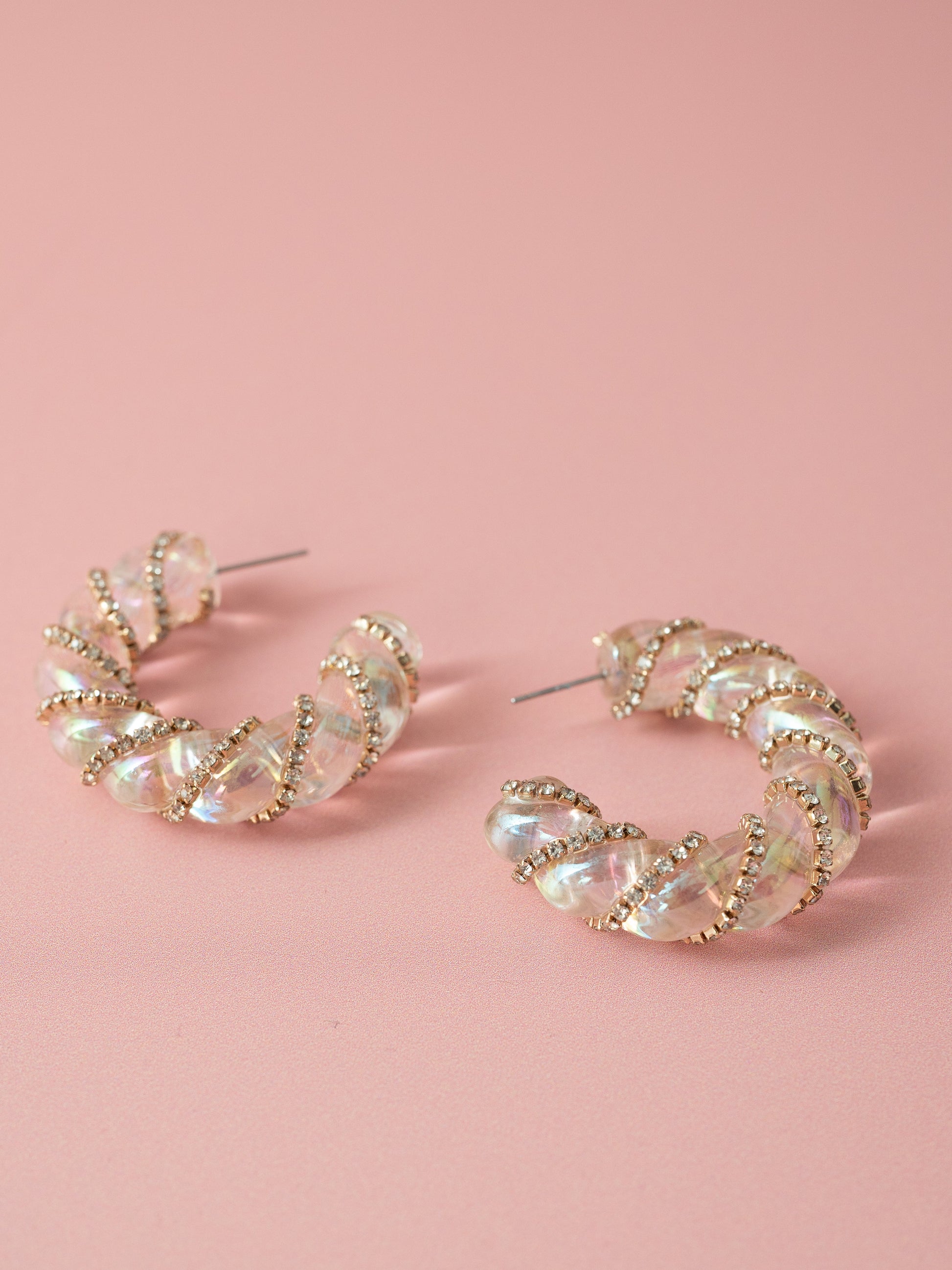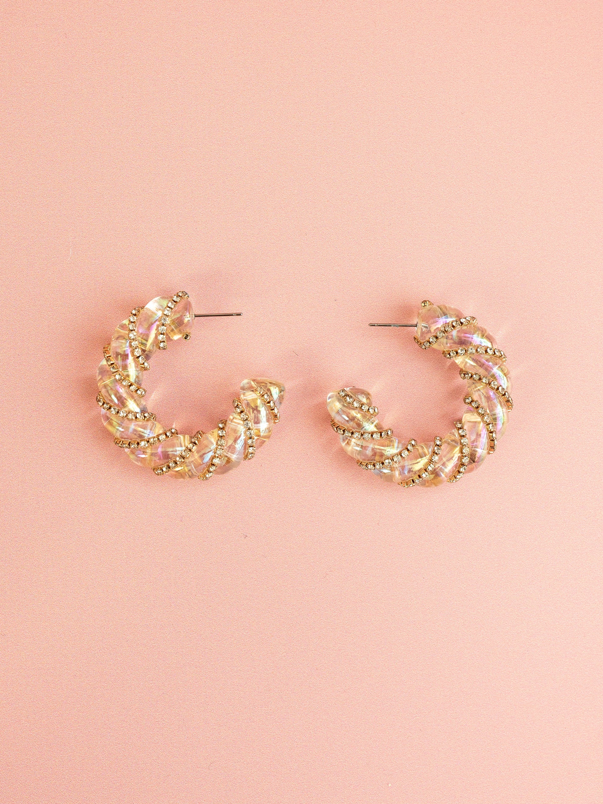 Indulge in the enchanting elegance of Clearly Chic Hoops. A clear iridescent hoop wrapped in sparkling cz, these earrings are ultra lightweight and catch the light from every angle. Elevate any outfit with these stunning statement pieces!