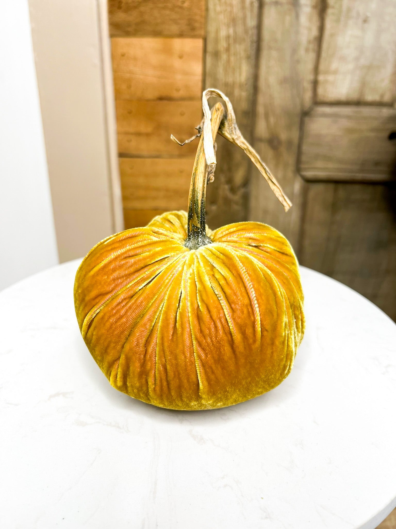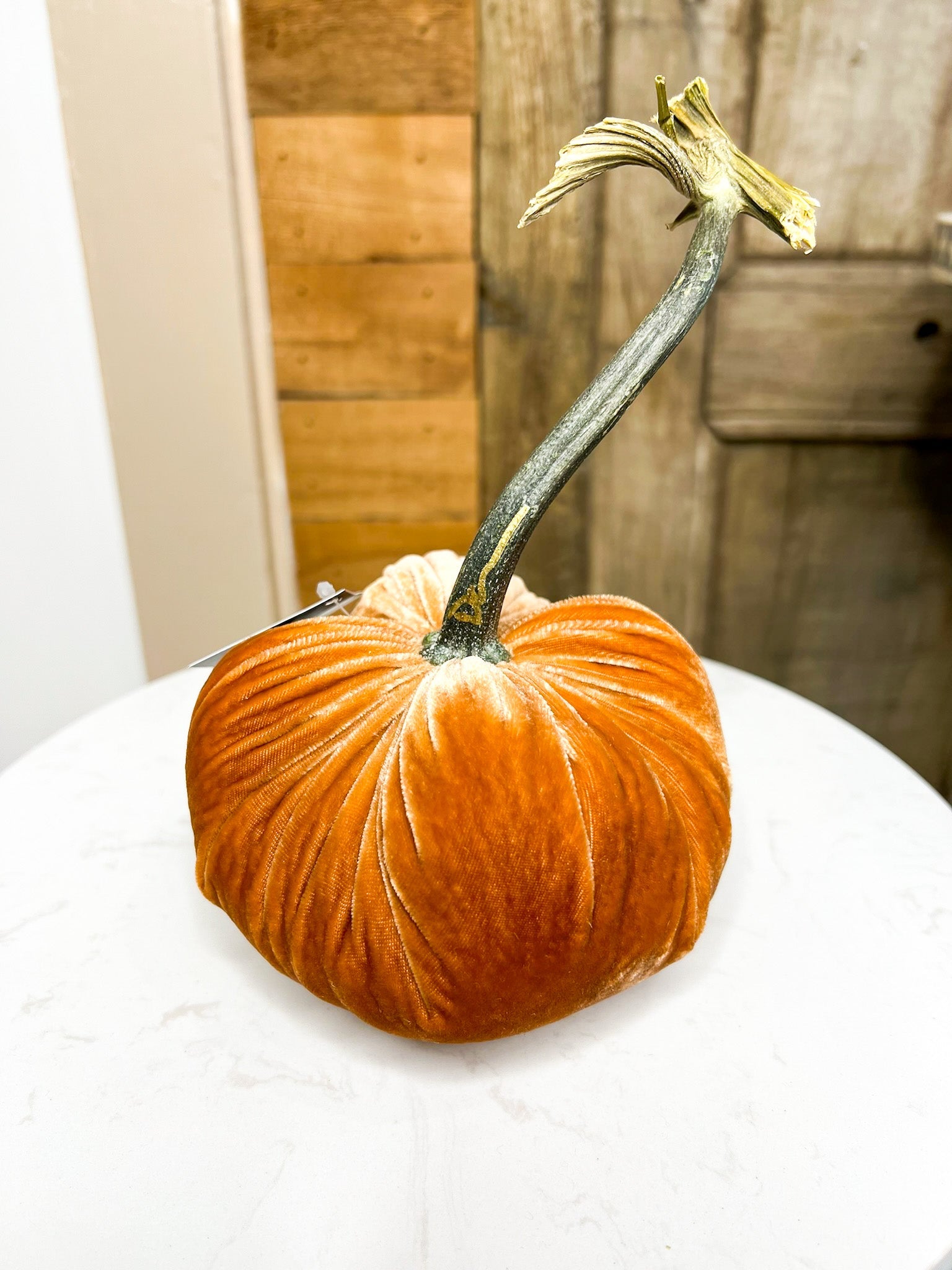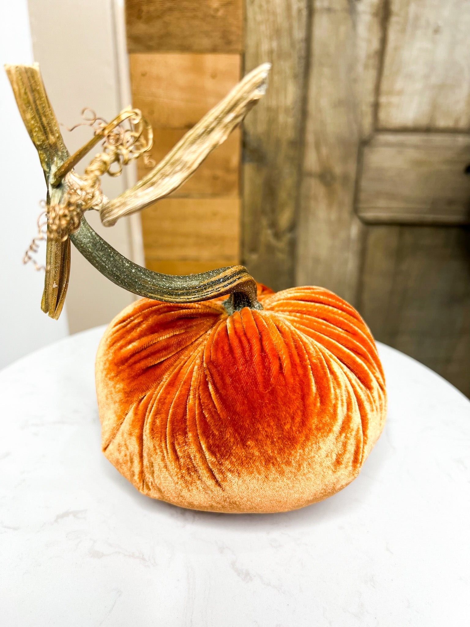 Fall pumpkins are growing here at Dos Femmes. These beautiful, handmade pumpkins are the perfect decor for your home this fall. Each decorative velvet pumpkin is finished with a natural stem, filled with crushed walnut shells, and made to perfection.