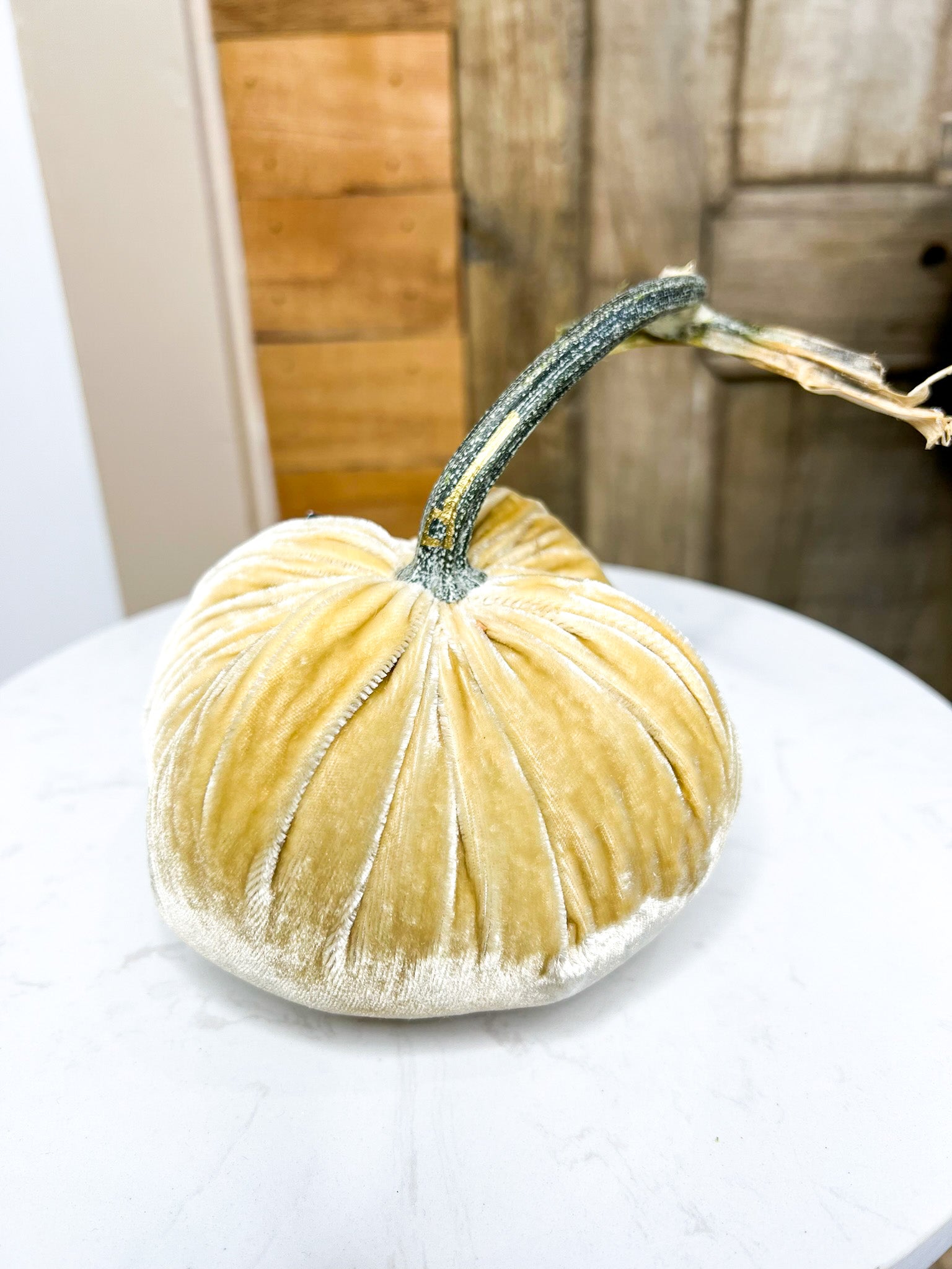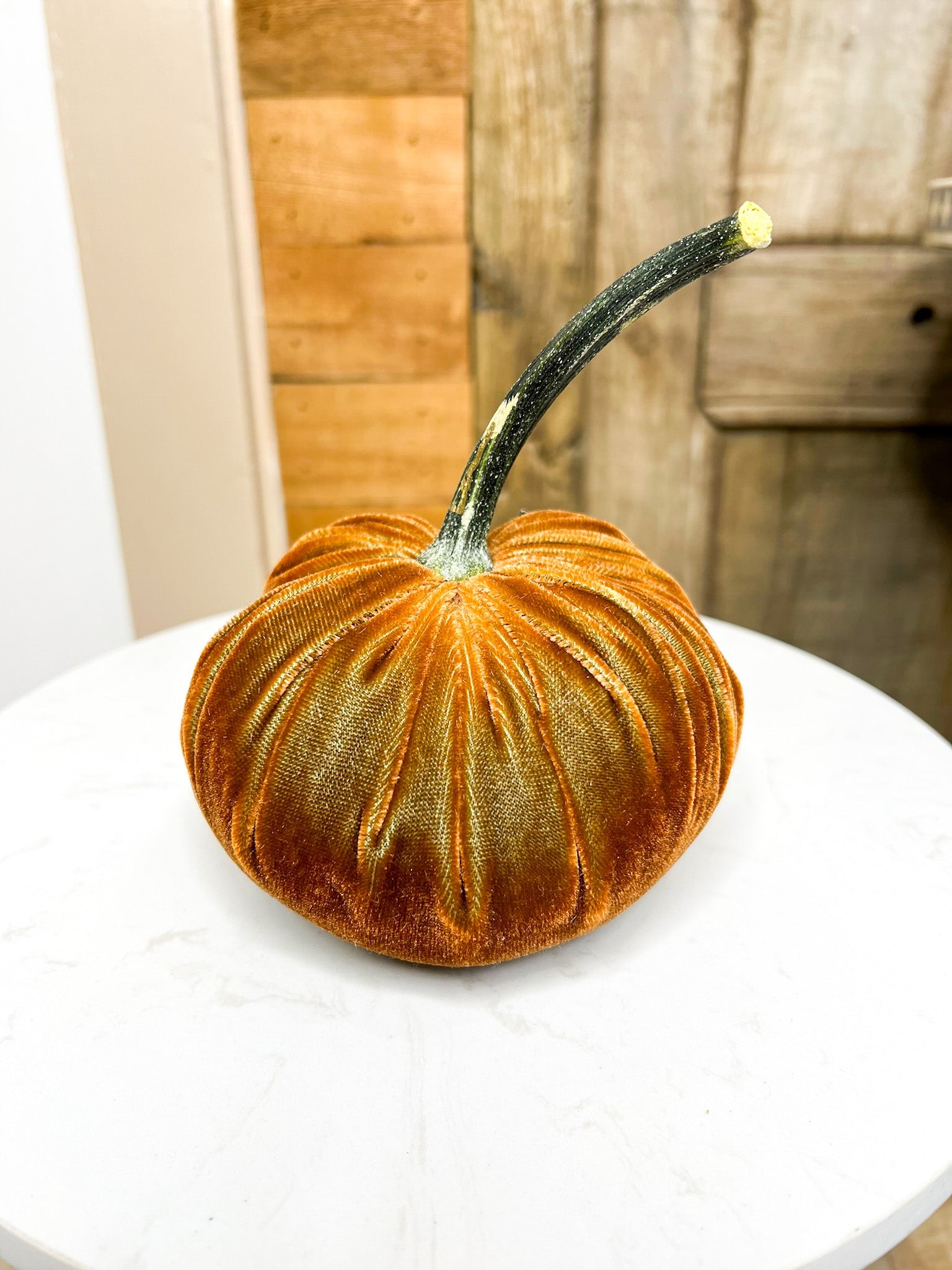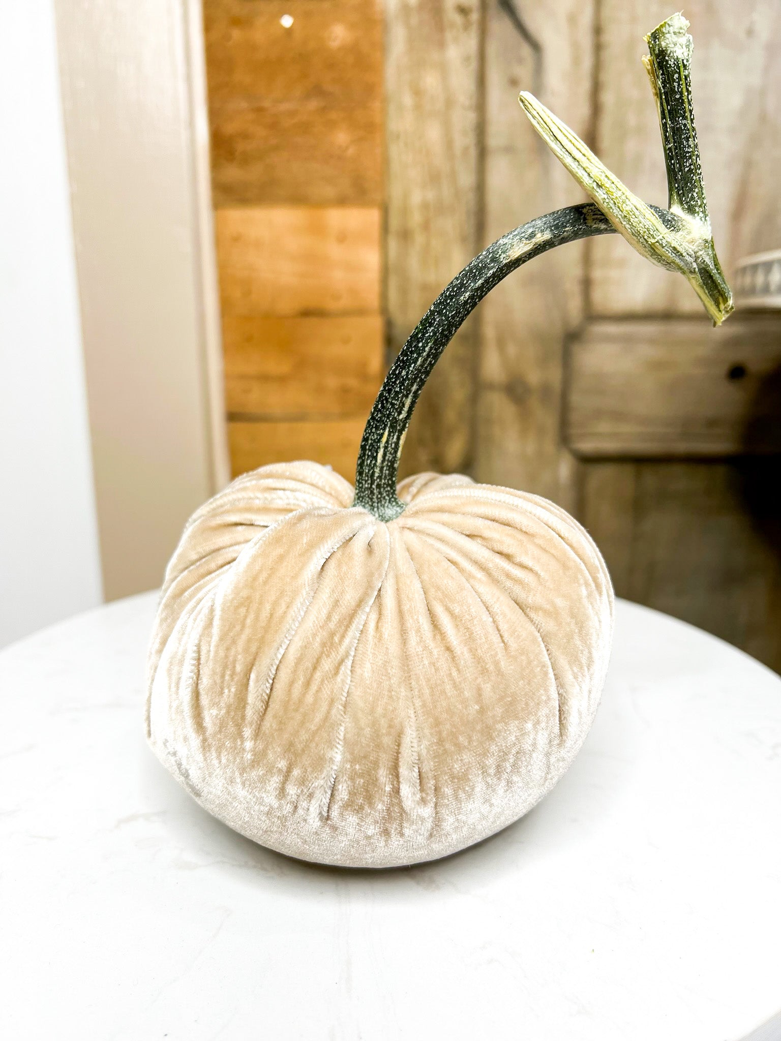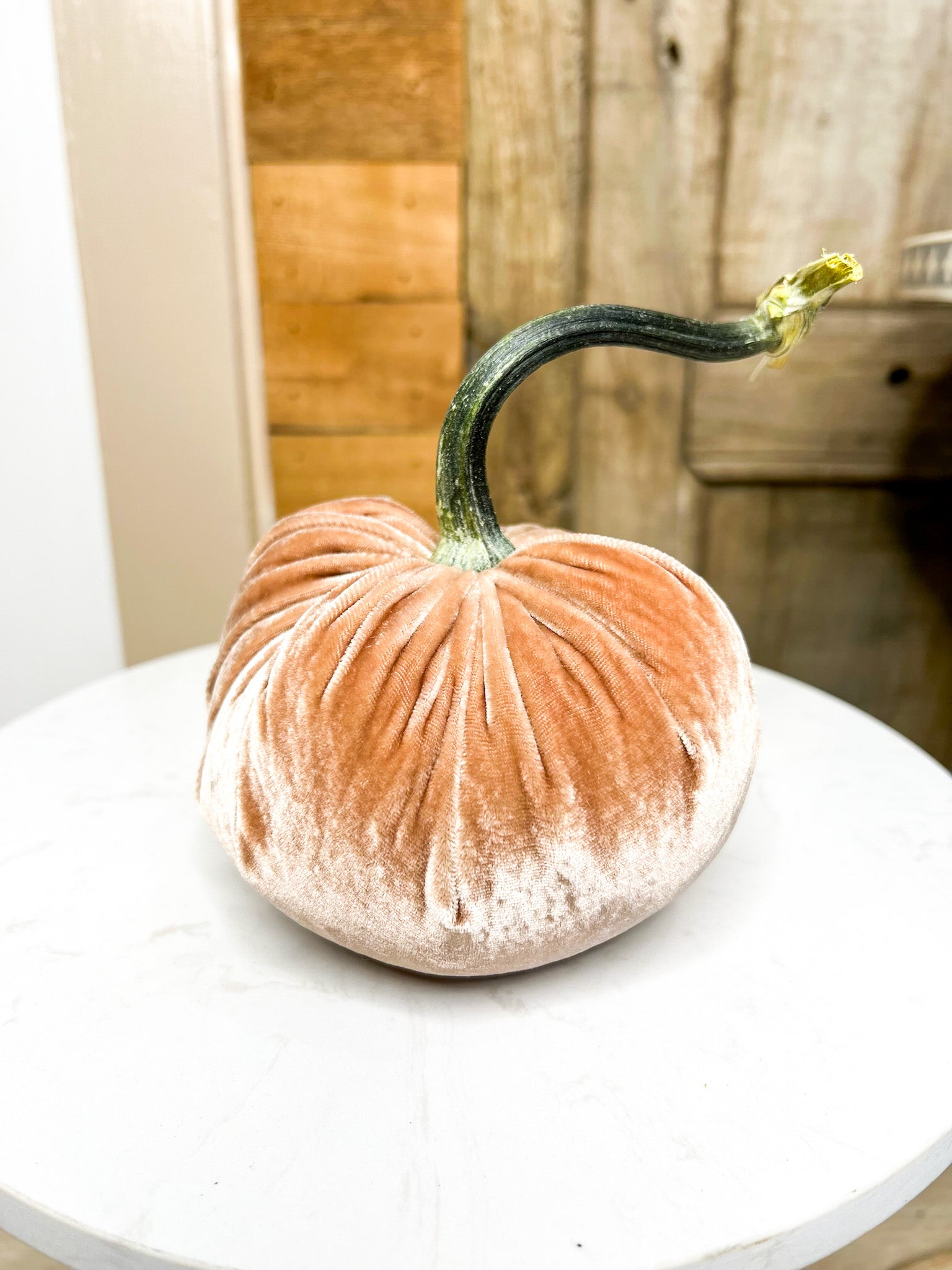 Fall pumpkins are growing here at Dos Femmes. These beautiful, handmade pumpkins are the perfect decor for your home this fall. Each decorative velvet pumpkin is finished with a natural stem, filled with crushed walnut shells, and made to perfection.