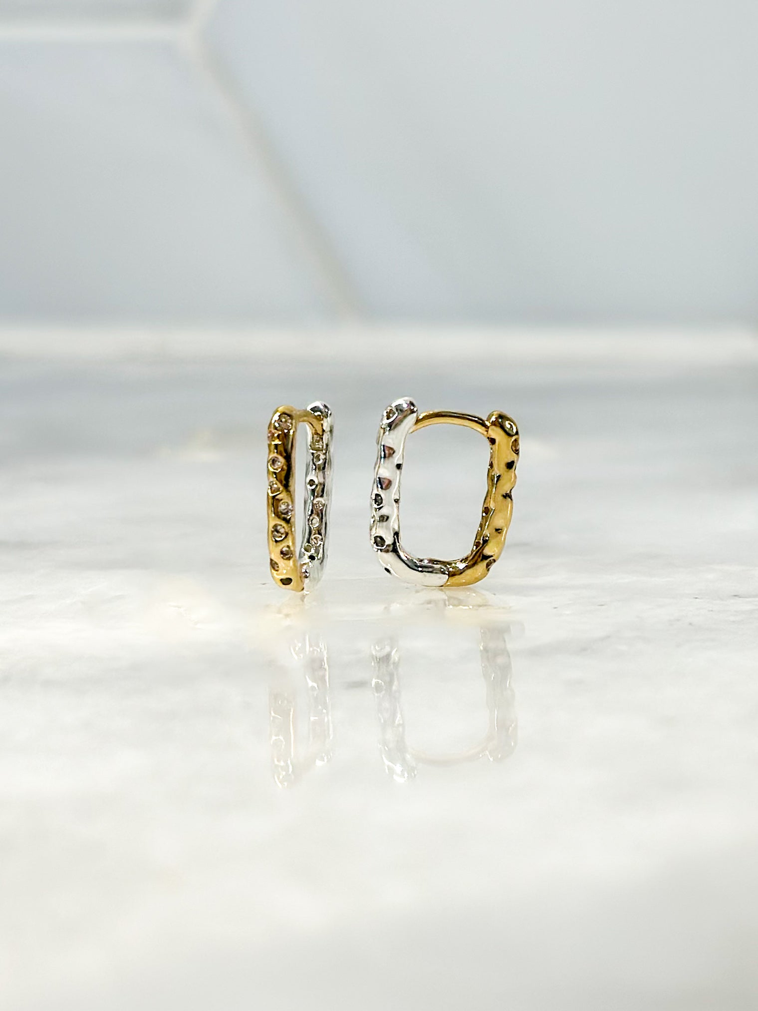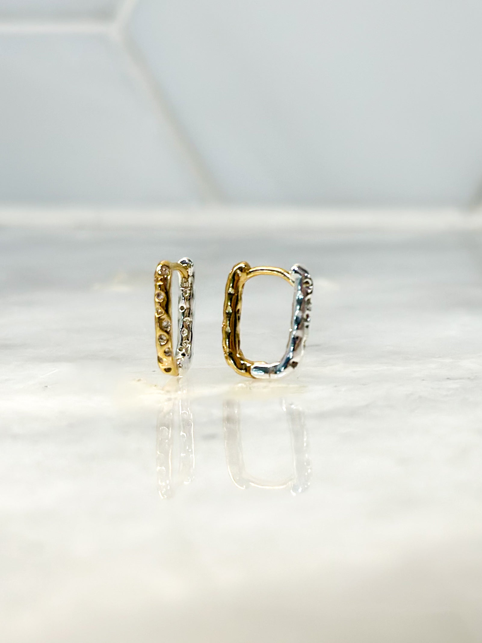 Experience ultimate comfort and style with our Gold & Silver Pavé Reversible Huggies! Made with gold plated brass and sterling silver, these Huggies are not only fashionable but also incredibly comfortable to wear. And the best part? They're reversible, giving you the freedom to choose which side to showcase. Elevate your look and make a statement with these stunning Huggies.