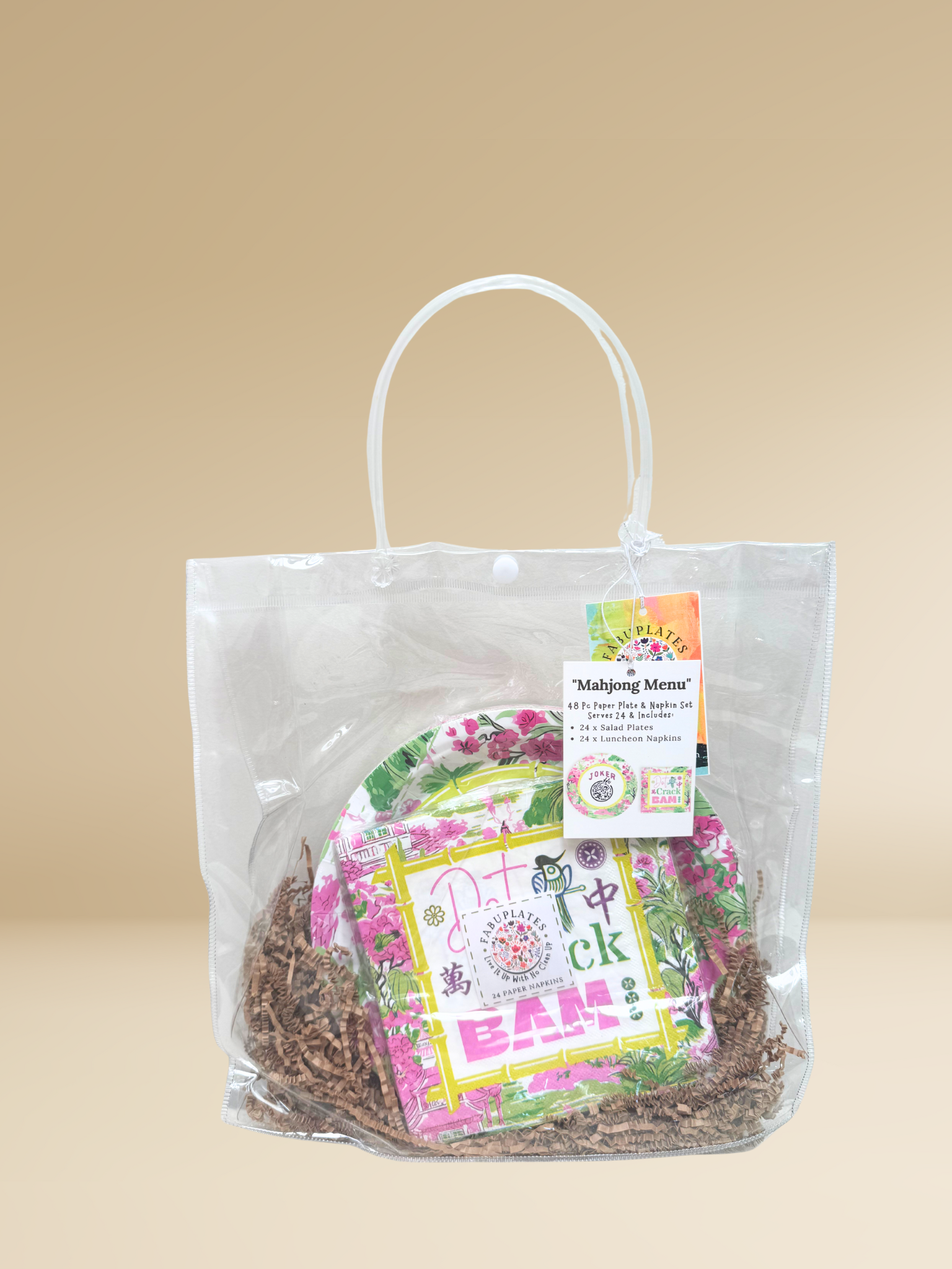 Bring bold color and playful charm to your next celebration with the Mahjong Menu "Vibrant Splash" Paper Plate & Napkin Set. Featuring eye-catching tropical florals and cheeky mahjong-inspired graphics, this 48-piece set is made to wow your guests and elevate your tablescape.