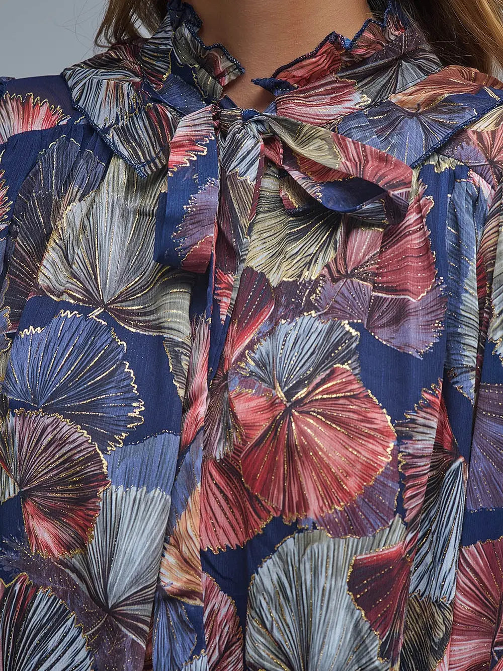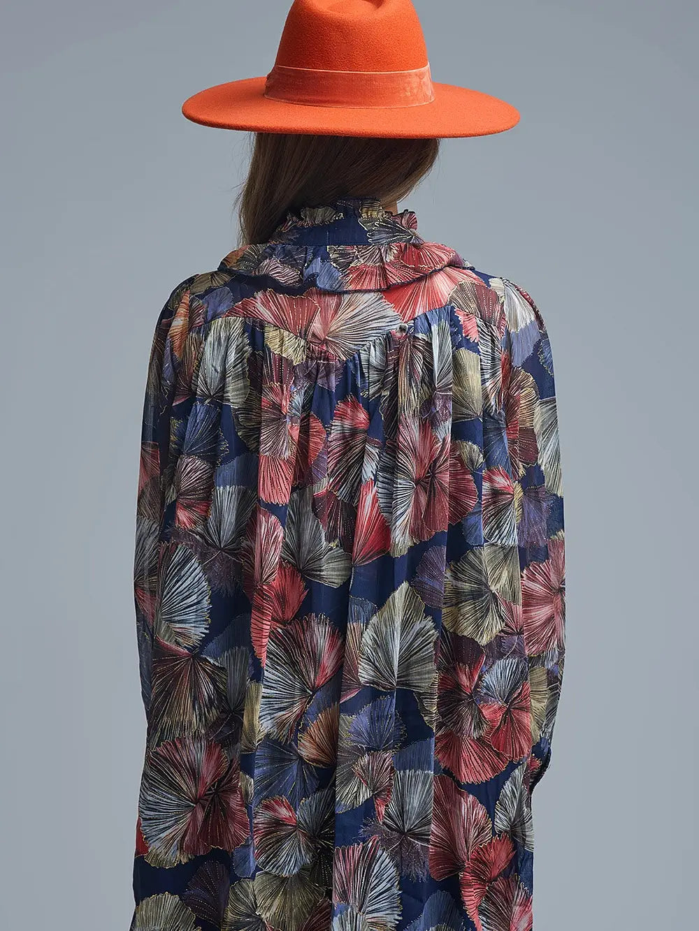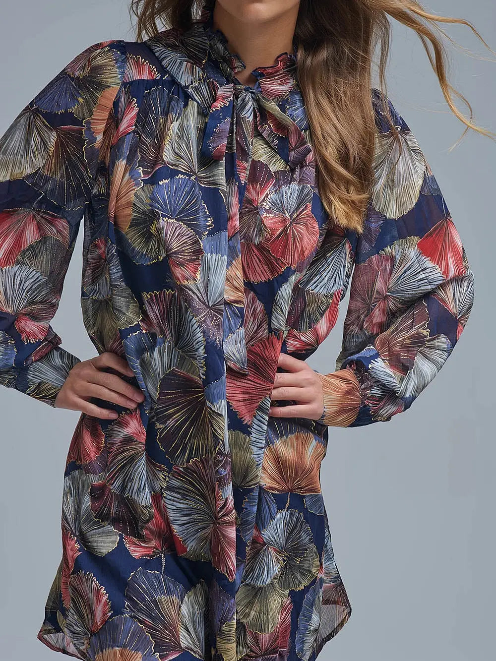 The Misty Dress is a sophisticated long-sleeve piece that transitions seamlessly from day to evening. Its loose, high-neck silhouette with tie closure creates an effortlessly polished look, while gently puffed sleeves that taper at the wrists add refined detail. The relaxed A-line cut flatters all figures, and the captivating floral pattern—rendered in warm rust and gold tones against a dark base—brings visual interest without overwhelming. Crafted from smooth, lustrous fabric with a subtle sheen, this versatile dress pairs equally well with sneakers for casual outings or heels for special occasions. A wardrobe essential that delivers both comfort and timeless elegance.