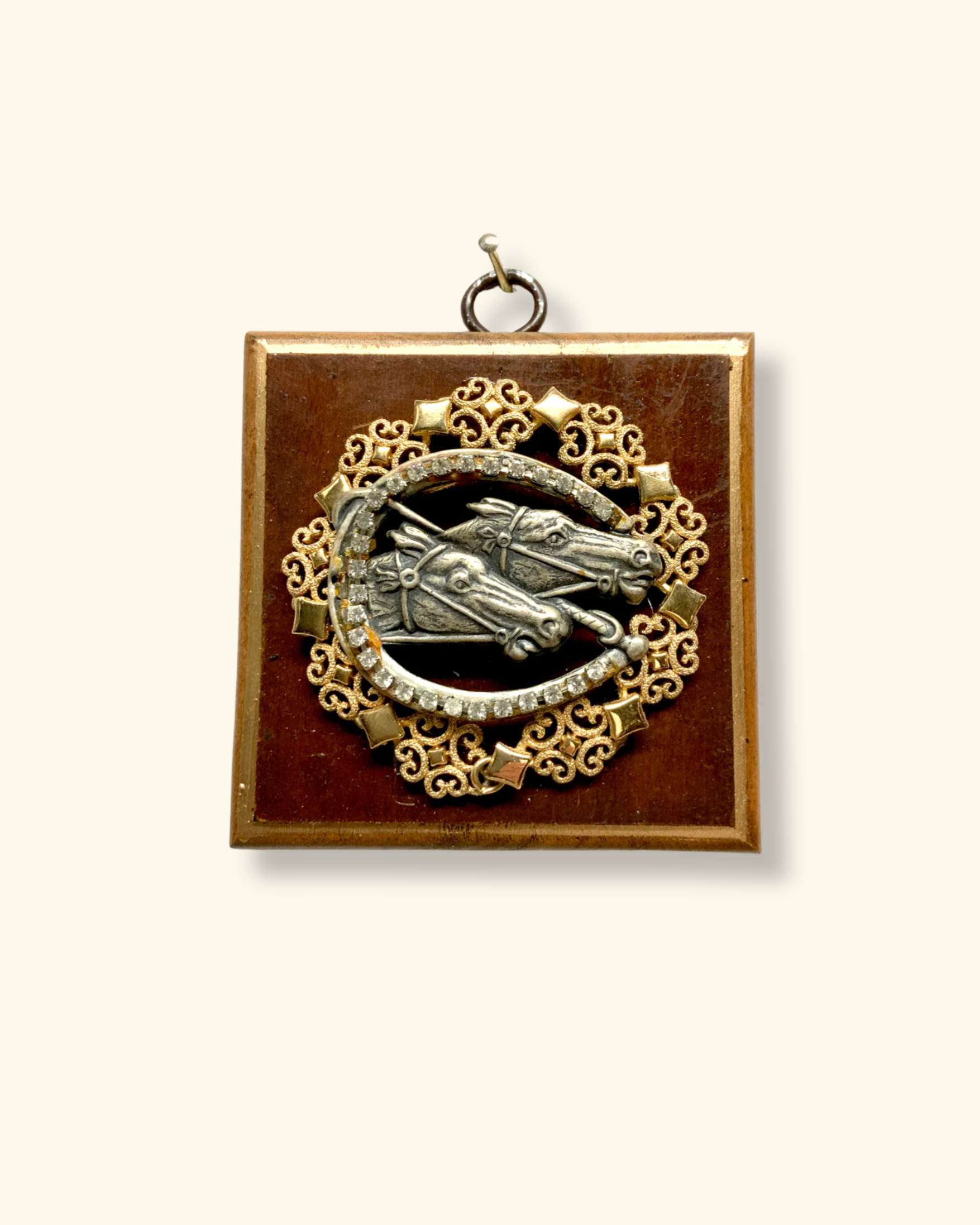Channel timeless elegance with this vintage-inspired wooden frame art featuring galloping racing horses adorned with shimmering rhinestones. The classic wood frame evokes nostalgic charm while the sparkling embellishments add contemporary glamour and movement to the composition. Each rhinestone catches light dynamically, bringing the horses to life with energy and sophistication. Perfect for equestrian enthusiasts, vintage collectors, or anyone seeking a statement piece that marries heritage aesthetics with luxe details. A captivating focal point that celebrates both tradition and refined taste.