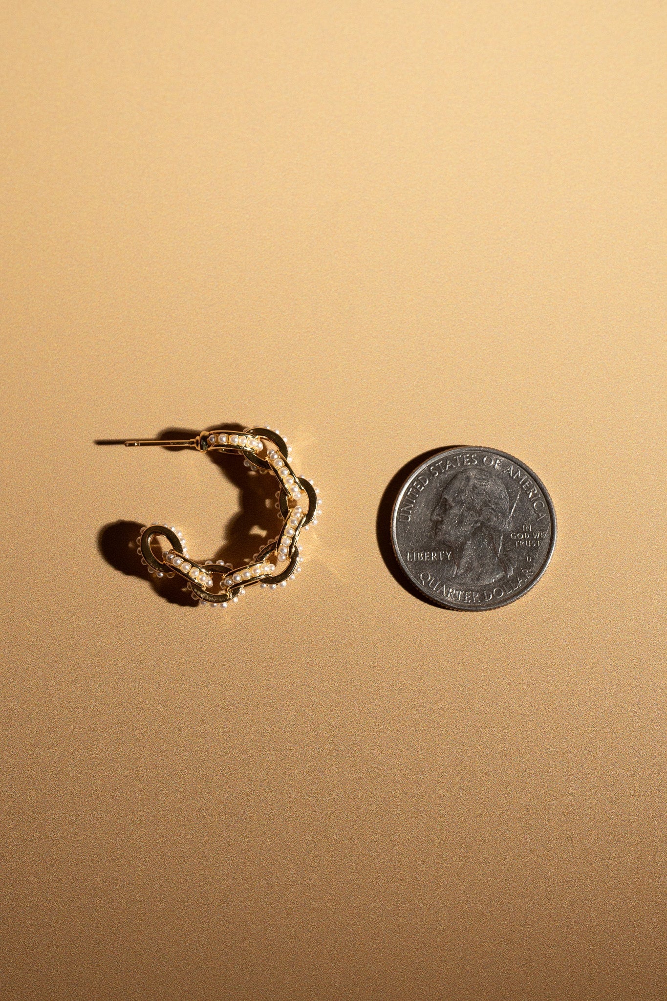 Upgrade your everyday hoops with our Pearl Link Hoops! Made from 14k gold plated brass, these smaller hoop earrings are perfect for daily wear. Featuring a unique design with gold chain links and tiny pearls, these earrings will add a touch of elegance to any outfit. Don't miss out on this modern twist on classic hoops!